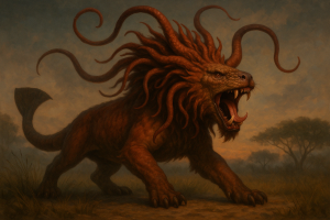 This tiger-sized reptomammal is covered in short reddish fur and males sport a large mane of tentacle-like appendages. Four of these tentacles are much larger then the rest are prehensile and used for mating displays, fighting rivals, and strangulating tough prey. When startled, the main stands on end to scare away or intimidate enemies. Their tails are thick and powerful, ending with a flat flap of tough skin that is also used to intimidate by slapping the ground with a resounding thud. At the very tip of the tail is a small barb used for maiming defeated rivals, a powerful male Ghorrim will have few scratches. Their jaws are lined with two rows of small, sharp teeth and they have a large three-pronged tongues. Their bellows sound like a very deep tuba and much of Khorrum is filled with their howls during mating season.